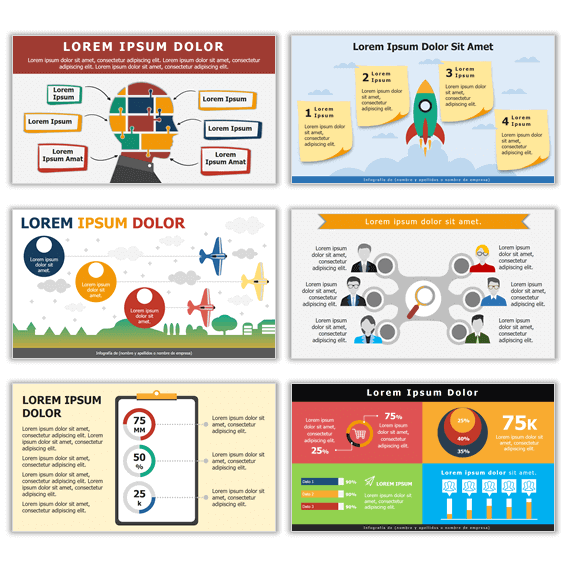 - Las plantillas para crear infografías con orientación horizontal están en 6 versiones de colores. (azul, rojo, amarillo-naranja, verde y 2 versiones multicolores)