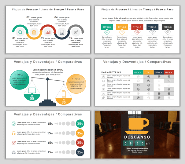 Las plantillas tienen las diapositivas necesarias para presentar perfiles personales, de empresa y equipo de trabajo, productos/servicios, reseñas de clientes/colaboradores, objetivos, datos y gráficos, tablas de precios, mapas mentales/ideas/soluciones, flujos de proceso, matriz dafo, planificación y/o estado de proyectos, calendario de reuniones/eventos, preguntas y respuestas, resultados generales y por área de trabajo, conclusiones, notas, agradecimientos, contacto, etc.